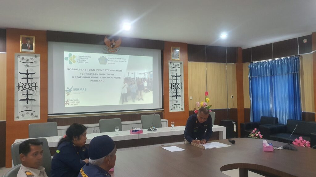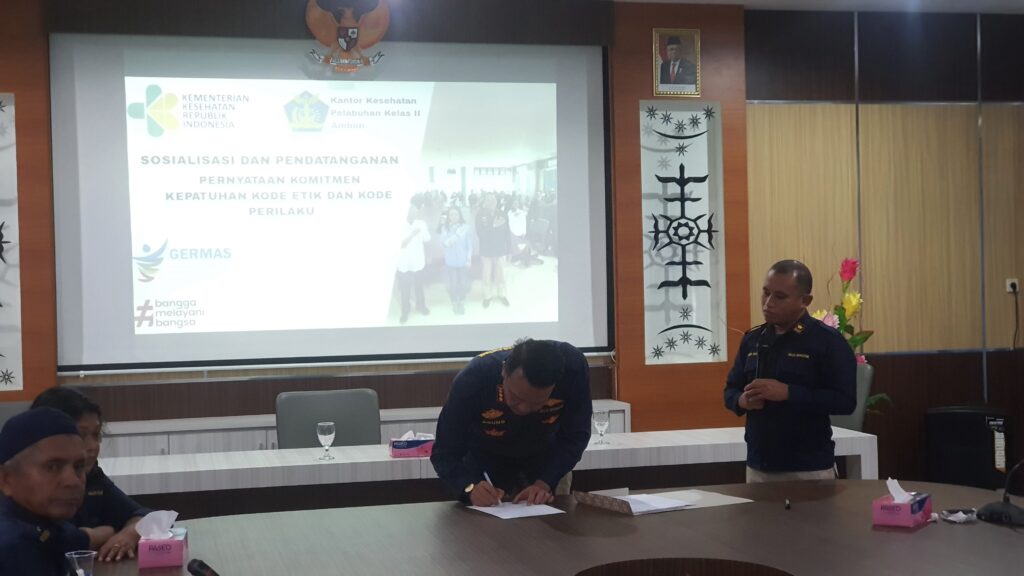 Dalam implementasinya Kementerian Kesehatan mengeluarkan Keputusan Menteri Kesehatan Republik Indonesia Nomor HK.01.07/Menkes/156/2023 Tahun 2023 tentang Kode Etik dan Kode Perilaku Aparatur Sipil Negara di Lingkungan Kementerian Kesehatan yang dalam rangkaian kegiatan sosialisasinya dipimpin dan dipresentasikan langsung oleh Kepala KKP Kelas II Ambon, Agung Ardyanto,SKM.,MPH. Puncak kegiatan sosialisasi ini ditandai dengan penandatangan Pernyataan Komitmen Kepatuhan Kode Etik Dan Kode Perilaku oleh seluruh ASN KKP Kelas II Ambon.
