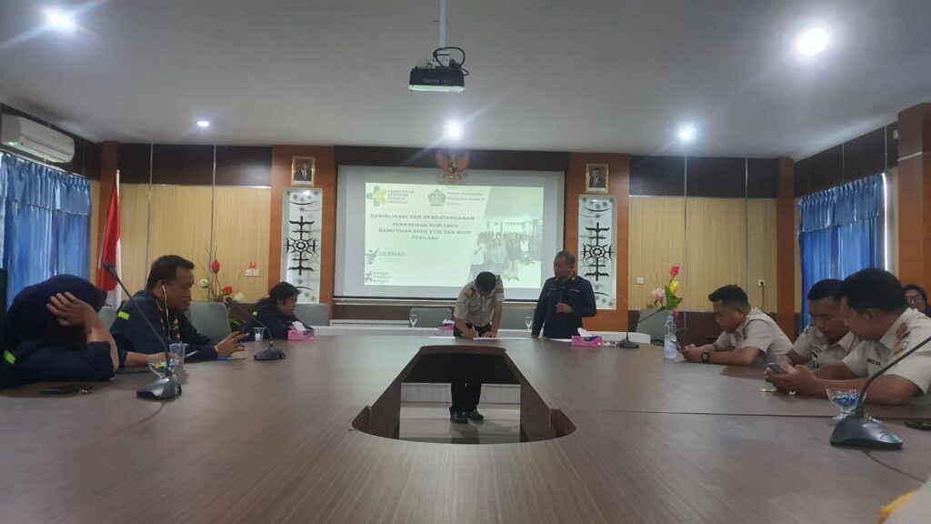 Kamis, 13 Juli 2023 bertempat di Aula Kantor Kesehatan Pelabuhan Kelas II Ambon dilaksanakan Sosialisasi Keputusan Menteri Kesehatan Republik Indonesia Nomor HK.01.07/Menkes/156/2023 Tahun 2023 tentang Kode Etik dan Kode Perilaku Aparatur Sipil Negara (ASN). hal ini berkaitan erat dengan penyelenggaraan negara yang dengan fungsi utama yaitu pelaksana kebijakan publik, pelayanan publik,perekat dan pemersatu bangsa agar dapat berjalan baik dan efektif maupun efisien, sehingga diperlukan regulasi yang mengatur tentang kode etik dan perilaku ASN yang wajib dipatuhi.